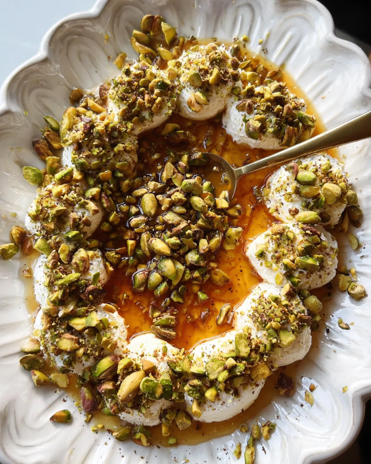 - Sprinkle the chopped or crushed pistachios on top of the cheese.