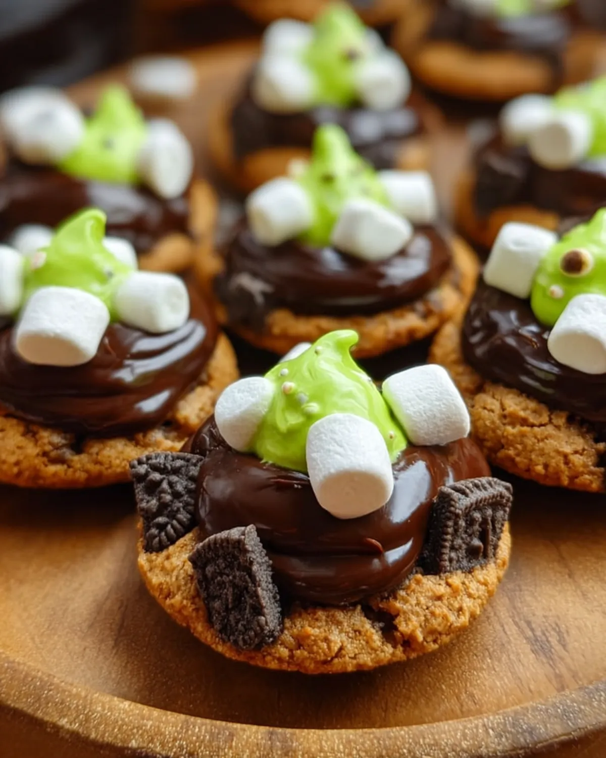 Magical chocolate cookies topped with vibrant green buttercream frosting, perfect for Halloween celebrations.