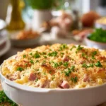 Chicken Blue Ribbon is a creamy, comforting casserole that brings together tender shredded chicken, savory ham, and gooey Swiss cheese all topped with a crunchy Panko breadcrumb layer. This dish is perfect for family gatherings, busy weeknights, or potlucks. It is hearty and satisfying, making it an all-time favorite for many.