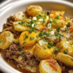 - Layer in the Crockpot: In the crockpot, layer half of the sliced potatoes at the bottom. Next, add half of the cooked beef and onion mixture. Follow this with a portion of the shredded cheddar cheese. Repeat these layers with the remaining potatoes, beef, and some cheese.