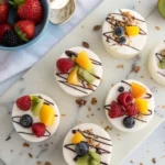 The genius of these frozen yoghurt bites lies in their perfect simplicity. We’re taking creamy Greek yogurt, naturally sweetening it with honey, and studding it with gorgeous fresh fruits like strawberries, blueberries, mango, and kiwi. The result is these beautiful, bite-sized frozen treats that are as stunning to look at as they are delicious to eat.