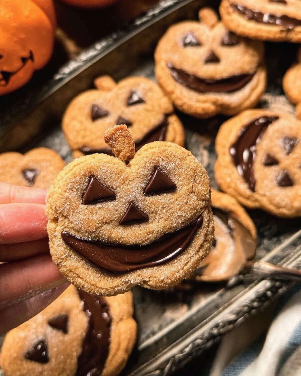 Delightfully decorated pumpkin-shaped cookies filled with smooth melted milk chocolate, perfect for Halloween or autumn gatherings.