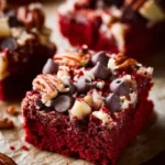 A delightful dessert that combines the rich flavors of red velvet cake with gooey bar texture, featuring layers of cookie, coconut, chocolate chips, and pecans.