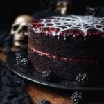 Deliciously dark and festive, the Spooky Black Velvet Halloween Cake features a rich black cocoa base and a luscious blackberry compote, perfect for Halloween celebrations.