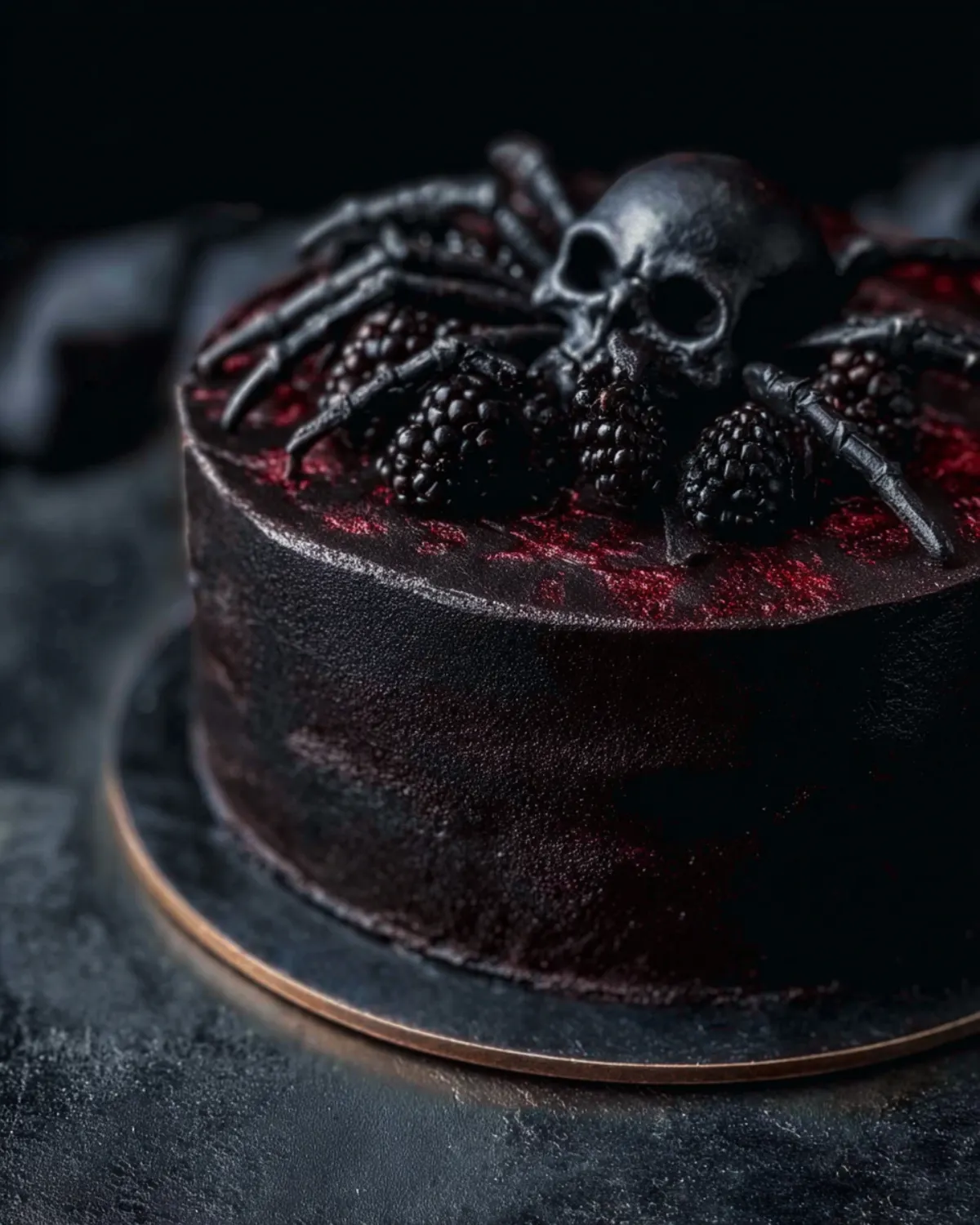 Deliciously dark and festive, the Spooky Black Velvet Halloween Cake features a rich black cocoa base and a luscious blackberry compote, perfect for Halloween celebrations.